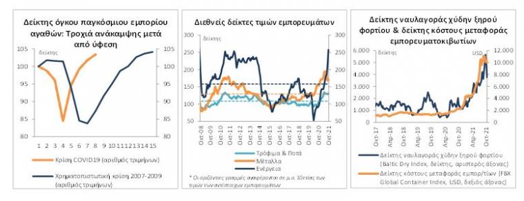 Ωστόσο, οι ανατιμήσεις στις διεθνείς τιμές εμπορευμάτων, εκτός μεμονωμένων κατηγοριών καυσίμων και τροφίμων, δεν είναι πρωτόγνωρες και προσομοιάζουν στις τάσεις που παρατηρήθηκαν κατά την ανάκαμψη της παγκόσμιας οικονομίας το 2010-11, η οποία επακολούθησε τη διεθνή χρηματοπιστωτική κρίση. Και τότε οι τιμές των περισσότερων εμπορευμάτων αυξήθηκαν έντονα, σε παρόμοια με τα σημερινά τους επίπεδα, τροφοδοτώντας τον πληθωρισμό, αλλά εν συνεχεία εξομαλύνθηκαν σε σχετικά σύντομο χρονικό διάστημα. Ομοίως, στην τρέχουσα συγκυρία, ήδη εμφανίζονται τα πρώτα σημάδια κορύφωσης αρκετών τιμών εμπορευμάτων, διεθνώς, παράλληλα με τις πρώιμες ενδείξεις ήπιας επιβράδυνσης της ταχύτητας ανόδου της οικονομικής δραστηριότητας κατά το 2ο εξάμηνο του 2021.