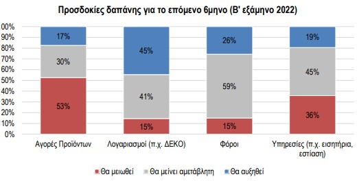 Συγκεκριμένα το 45% εκτιμά ότι το δεύτερο εξάμηνο 2022 οι δαπάνες για λογαριασμούς κοινής ωφέλειας θα είναι αυξημένες. Από την άλλη πλευρά το 53% των καταναλωτών εκτιμά ότι οι δαπάνες για αγορές προϊόντων το δεύτερο εξάμηνο 2022 θα είναι μειωμένες, και μόλις το 17% ότι θα είναι αυξημένες.