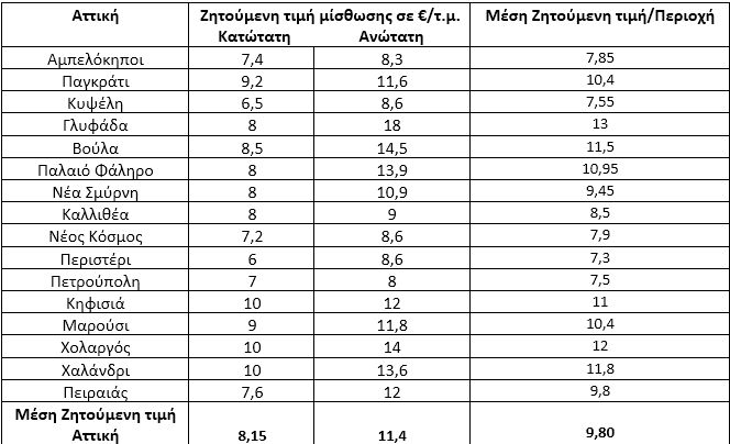 Η μέση κατώτατη ζητούμενη τιμή μίσθωσης σύμφωνα με τις αναρτημένες αγγελίες ακινήτων σε ιστοσελίδες στην Αθήνα διαμορφώνεται στα 8,15 €/τ.μ. και η μέση ανώτατη στα 11,4 €/τ.μ., δηλαδή, μια οικογένεια θα πρέπει να καταβάλει μόνο για το ενοίκιο από 815 €/μήνα έως και 1.140 €/μήνα αν πρόκειται για κατοικία 100 τ.μ. άνω του 1ου ορόφου κατασκευής μετά το 2000.