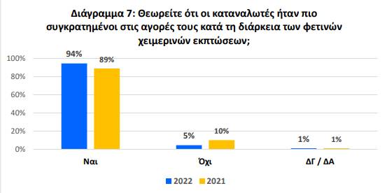 7. Το 94% των επιχειρήσεων χαρακτήρισαν τους καταναλωτές πιο συγκρατημένους στις αγορές τους, εύρημα δυσμενέστερο σε σχέση με πέρυσι, όπου αντίστοιχα κυμαινόταν στο 89%. Το γεγονός αυτό συνηγορεί στην αβεβαιότητα που επικρατεί στην αγορά. Οι πρόσφατες ανατιμήσεις οι οποίες ιδιαίτερα το τελευταίο διάστημα, φαίνεται να έχουν συρρικνώσει τηδαπάνη των καταναλωτών σε προϊόντα ελαστικής ζήτησης.