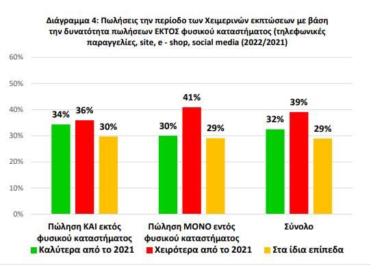 4. Επιπλέον, από την έρευνα προκύπτει πως οι επιχειρήσεις που είχαν δυνατότητα πωλήσεων και εκτός φυσικού καταστήματος (τηλεφωνικές παραγγελίες, πωλήσεις μέσω κοινωνικών δικτύων, site, e-shop) εμφάνισαν ελαφρώς καλύτερες επιδόσεις (34%) σε σχέση με εκείνες που δεν είχαν.