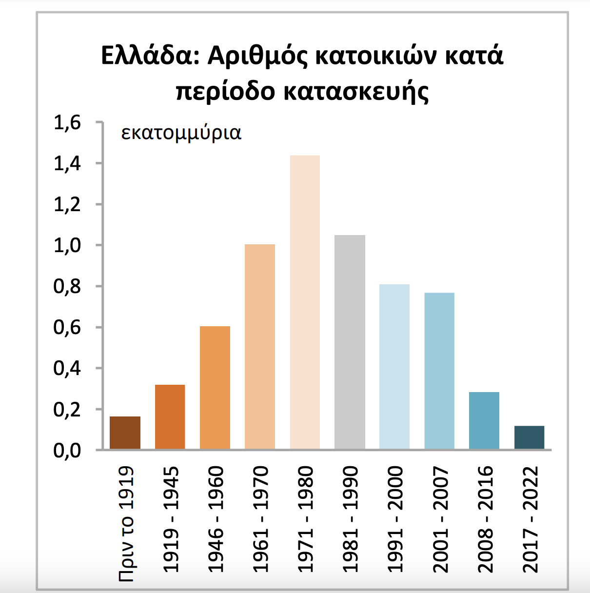 Αποτέλεσμα, το απόθεμα των κατοικιών στη χώρα μας να ξεπερνά πλέον σε ηλικία τα 40 χρόνια, από τα 34 έτη που ήταν στις αρχές της προηγούμενης δεκαετίας, το 2011, όπως διαπιστώνει η τελευταία έκθεση της Εθνικής Τράπεζας για την κατοικία στη χώρα μας. Παράλληλα, μεγάλο έλλειμμα καταγράφεται και σε εργασίες για ανακαίνιση από τα νοικοκυριά του γηρασμένου κτιριακού αποθέματος, δεδομένου ότι ποσοστό 55% των υφιστάμενων κτιρίων κατοικιών έχει κατασκευαστεί πριν από τη δεκαετία του ’80.