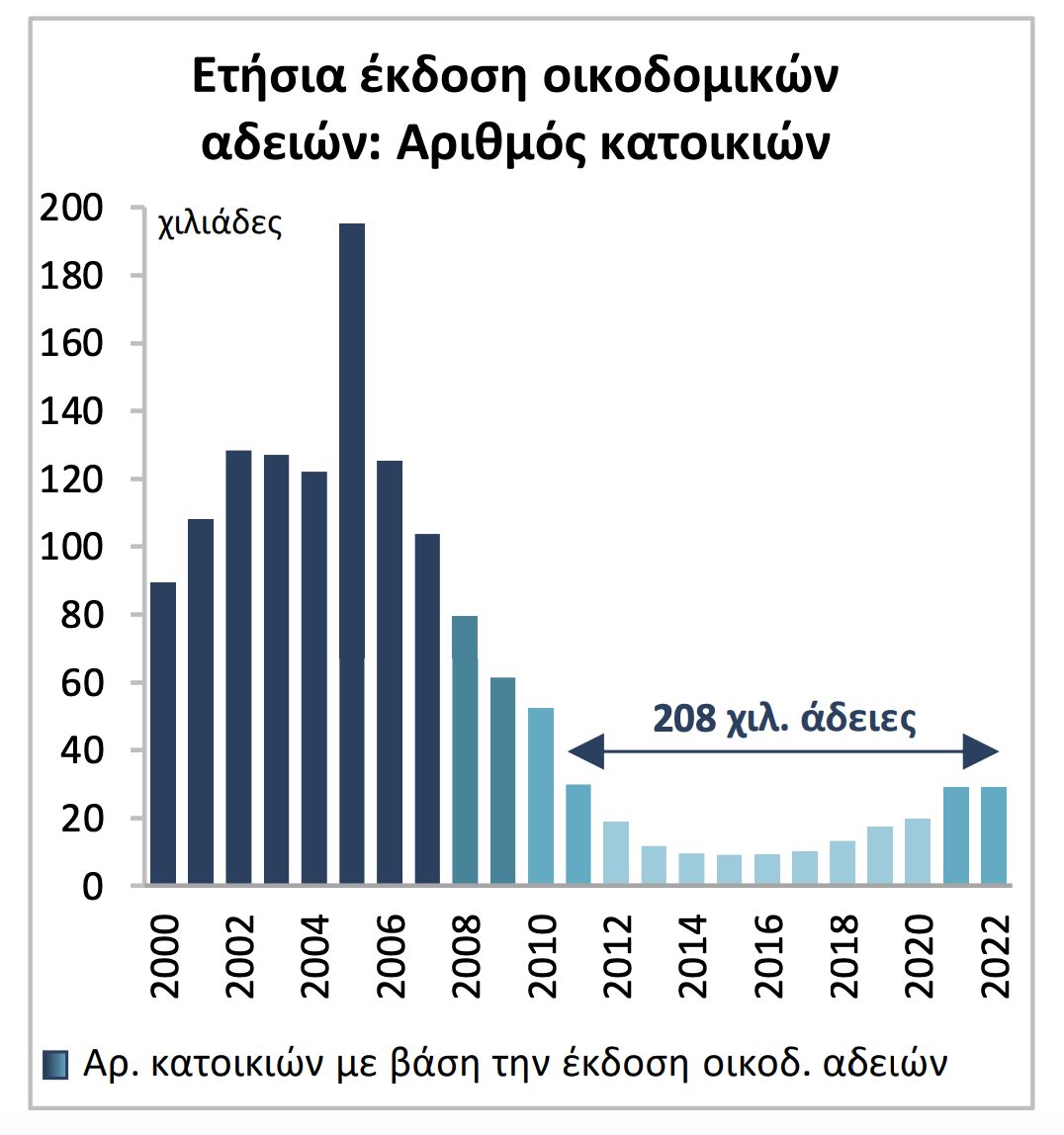Ειδικότερα όσον αφορά τα επιμέρους νούμερα, η έκδοση οικοδομικών αδειών για νέες κατοικίες έχει τώρα τριπλασιαστεί, φτάνοντας σε σχεδόν 30 χιλ. ετησίως το 2021-22, ύστερα από δραστική υποχώρηση ακόμη και στα πέριξ των 10 χιλ. ετησίως εντός της περιόδου 2013-17, όταν η οικοδομική δραστηριότητα είχε μειωθεί σχεδόν κατά 90% σε σύγκριση με τα προ κρίσης (από 130.000 ετησίως τη «χρυσή» περίοδο 2001- 07). Αντίστοιχα, οι επενδύσεις σε κατοικίες σε σταθερές τιμές, όπως αντικατοπτρίζεται στα στοιχεία των εθνικών λογαριασμών, έπεσε στα 2,2 δισ. ευρώ ετησίως την περίοδο 2012-20 από ένα ανώτατο όριο 24,9 δισ. ευρώ το 2007 και κατά μέσο όρο 16 δισ. ευρώ την περίοδο 1995-2010.