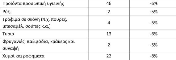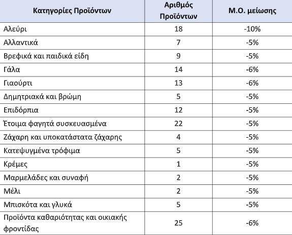 Ακολουθούν οι 21 κατηγορίες που εντάσσονται τα 233 προϊόντα καθώς και ο μέσος όρος μείωσης τιμής: