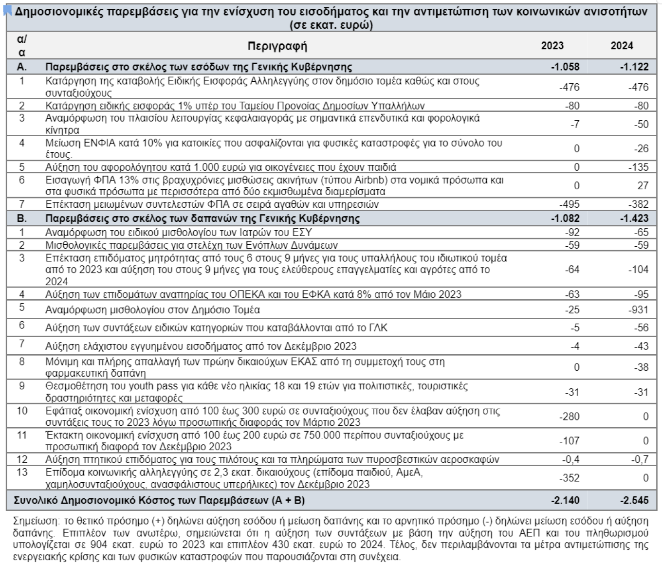 Μετά τις διπλές εκλογές του Μαΐου - Ιουνίου 2023, τον σχηματισμό κυβέρνησης τον Ιούνιο 2023 και τις προγραμματικές δηλώσεις, εξαγγέλθηκε πλέγμα παρεμβάσεων, που αφορούσε στο δεύτερο εξάμηνο του έτους 2023 και το 2024, για την τόνωση του διαθέσιμου εισοδήματος και τη μείωση των ανισοτήτων. Ειδικότερα, προβλέφθηκαν τα παρακάτω μέτρα: