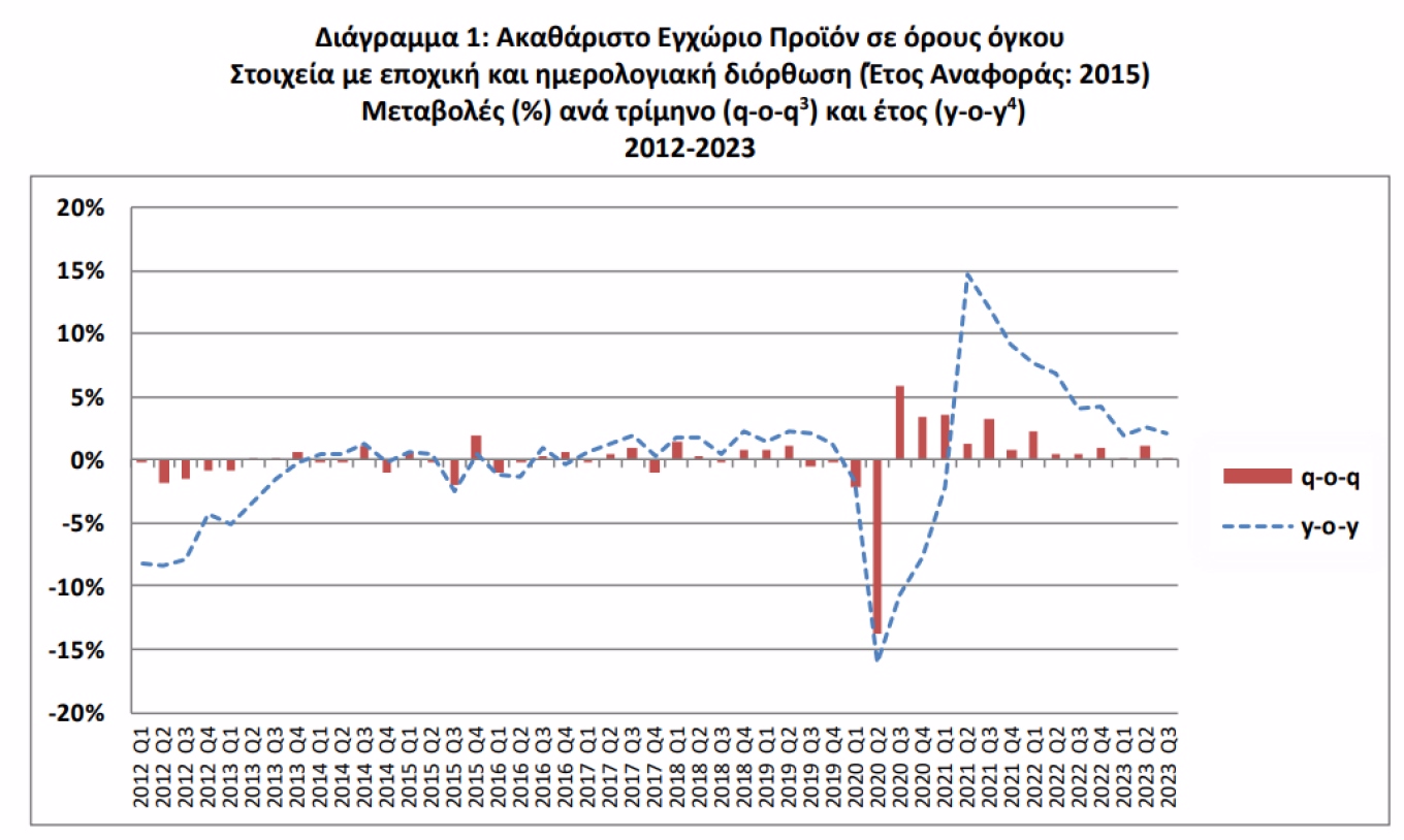Με βάση τα μη εποχικά διορθωμένα στοιχεία το Ακαθάριστο Εγχώριο Προϊόν (ΑΕΠ) σε όρους όγκου, κατά το 3 ο τρίμηνο 2023 παρουσίασε αύξηση κατά 1,8% σε σχέση με το 3 ο τρίμηνο 2022,αναφέρει το protothema.gr.