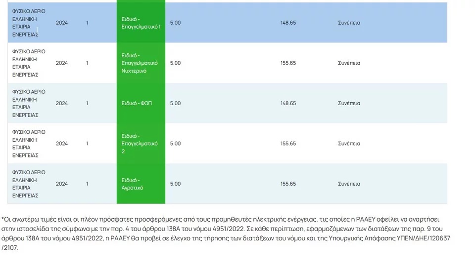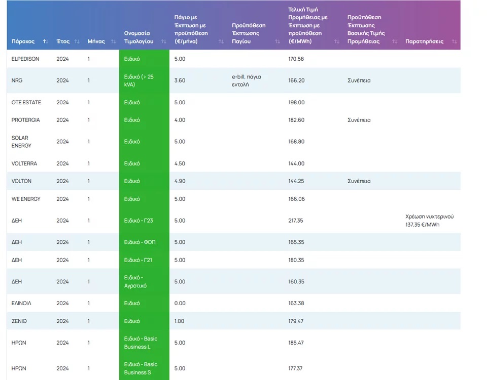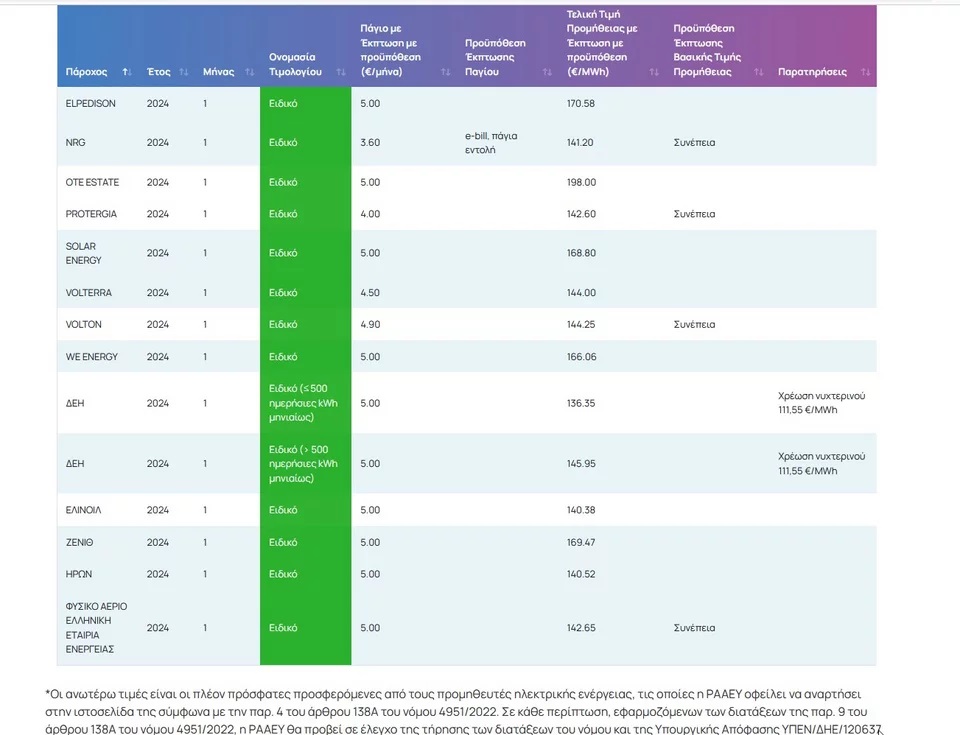 Συνοπτικά οι τιμές ανά εταιρεία στο πράσινο τιμολόγιο: