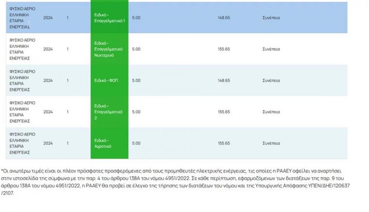 Οι τιμές των ειδικών «πράσινων» τιμολογίων θα αναρτώνται στον πίνακα έως την 5η ημέρα κάθε μήνα.