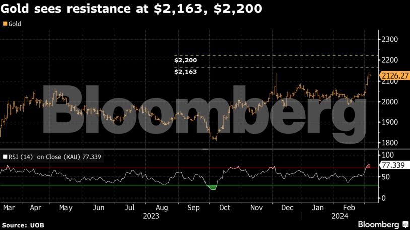 Η United Overseas Bank Ltd. υπολογίζει πως το επόμενο ψυχολογικό όριο για το πολύτιμο μέταλλο κυμαίνεται στα 2.163 δολάρια. Παρ’ όλα αυτά, όπως υποστηρίζει η αναλυτής της StoneX Financial Ltd., Ρόνα Ο’ Κόνελ, ο χρυσός θεωρείται ήδη overbought πάνω από τα 2.115 δολάρια/ουγγιά.
