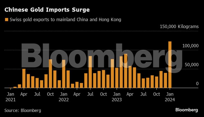 Οι ελβετικές εξαγωγές προς την Κίνα, oι οποίες συνήθως αποτελούν έναν καλό δείκτη της κινεζικής ζήτησης για χρυσό σχεδόν τριπλασιάστηκαν τον Ιανουάριο, καθώς οι καταναλωτές αναζήτησαν αντισταθμιστικό παράγοντα έναντι των ταραχών στα χρηματιστήρια και τον τομέα ακινήτων της χώρας.