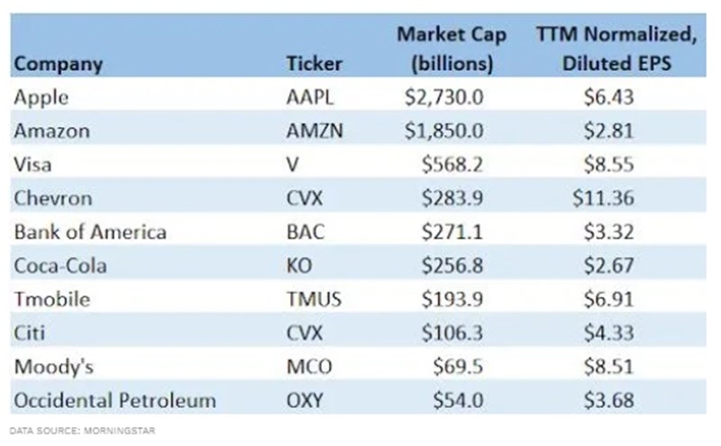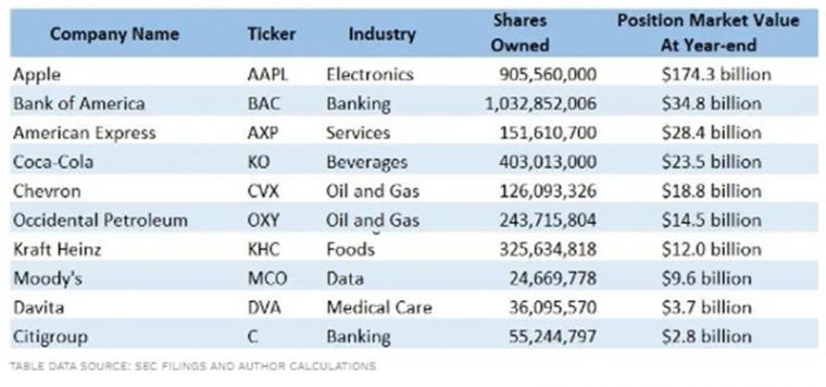Ο πίνακας που ακολουθεί παρουσιάζει τις 10 μεγαλύτερες θέσεις του Μπάφετ. Η συνολική αξία τους στο τέλος του 2023 ήταν 322 δισ. δολάρια, δηλαδή περίπου το 93% του χαρτοφυλακίου συνολικής αξίας 347 δισ. δολαρίων.