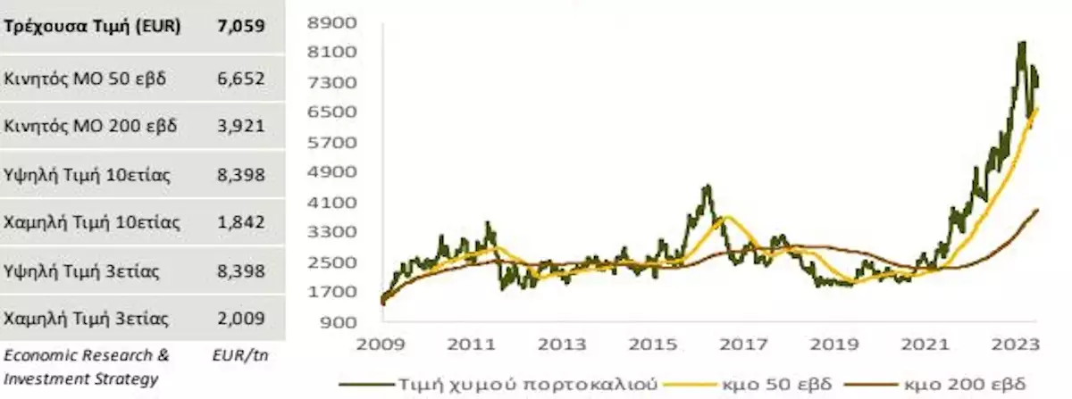 Το τμήμα Οικονομικής Ανάλυσης & Επενδυτικής Στρατηγικής της Τράπεζας Πειραιώς, αφήνει ένα περιθώριο για περαιτέρω αυξήσεις στην τιμή του χυμού πορτοκαλιού.