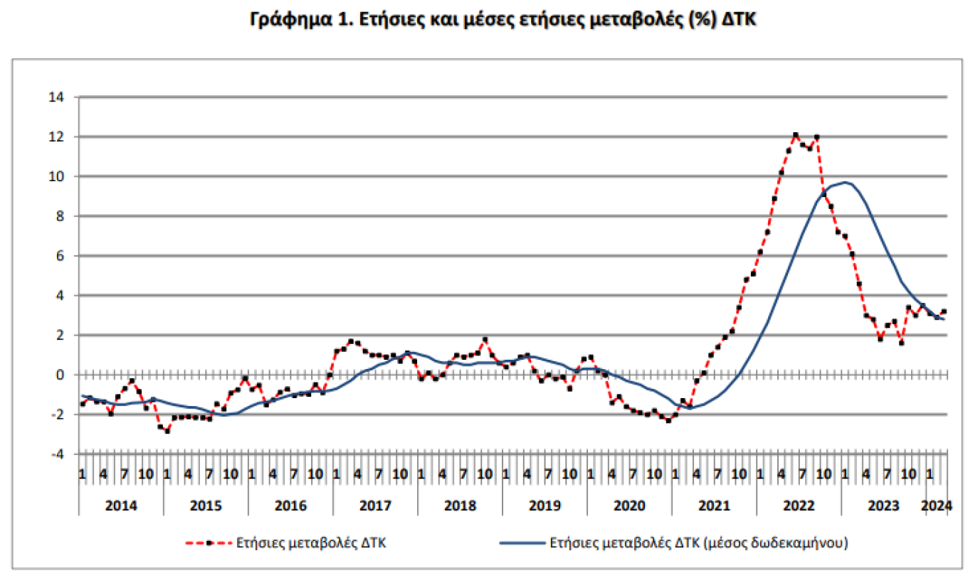 Ο μέσος ΔΤΚ του δωδεκαμήνου Απριλίου 2023 - Μαρτίου 2024, σε σύγκριση με τον αντίστοιχο Δείκτη του δωδεκαμήνου Απριλίου 2022 - Μαρτίου 2023, παρουσίασε αύξηση 2,8%, έναντι αύξησης 9,2% που σημειώθηκε κατά την αντίστοιχη σύγκριση του δωδεκαμήνου Απριλίου 2022 - Μαρτίου 2023 με το δωδεκάμηνο Απριλίου 2021 - Μαρτίου 2022.