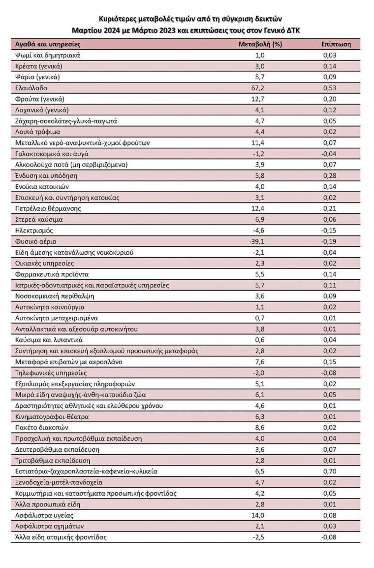 Η αύξηση του Γενικού ΔΤΚ κατά 3,2% τον μήνα Μάρτιο 2024, σε σύγκριση με τον αντίστοιχο Δείκτη του Μαρτίου 2023, προήλθε κυρίως από τις μεταβολές στις ακόλουθες ομάδες αγαθών και υπηρεσιών: