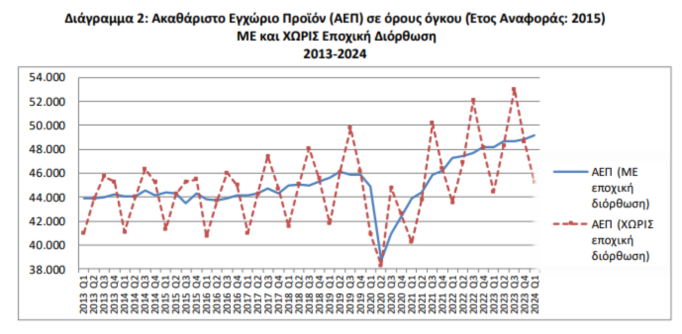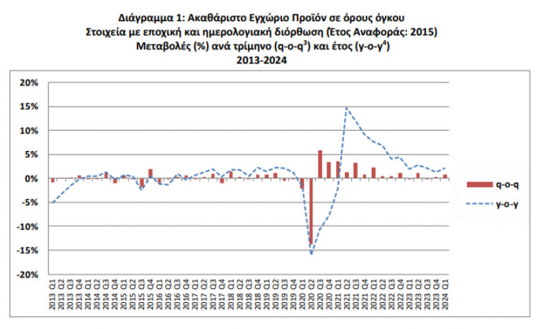 Αναλυτικά, με βάση τα διαθέσιμα εποχικά διορθωμένα στοιχεία1 , το Ακαθάριστο Εγχώριο Προϊόν (ΑΕΠ) σε όρους όγκου2, κατά το 1 ο τρίμηνο 2024 παρουσίασε αύξηση κατά 0,7%, σε σχέση με το 4 ο τρίμηνο 2023, ενώ σε σύγκριση με το 1 ο τρίμηνο 2023 παρουσίασε αύξηση κατά 2,1%.