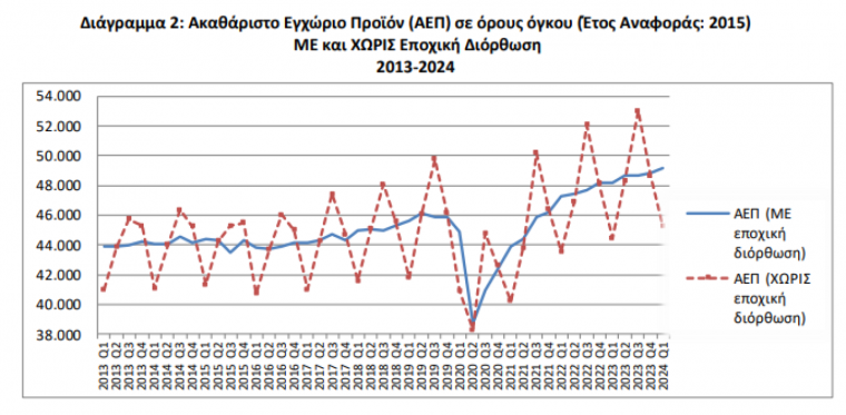Με βάση τα μη εποχικά διορθωμένα στοιχεία το Ακαθάριστο Εγχώριο Προϊόν (ΑΕΠ) σε όρους όγκου, κατά το 1 ο τρίμηνο 2024 παρουσίασε αύξηση κατά 1,9% σε σχέση με το 1 ο τρίμηνο 2023.