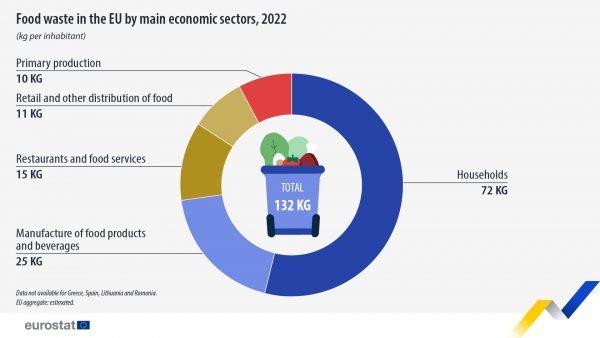 Σύμφωνα με τη Eurostat , το 2022, περίπου 132 χιλιόγραμμα (kg) τροφίμων ανά κάτοικο σπαταλούνταν στην ΕΕ. Συνολικά, η ΕΕ παρήγαγε 59,2 εκατομμύρια τόνους αποβλήτων τροφίμων, τα οποία περιλαμβάνουν βρώσιμα και μη βρώσιμα μέρη.