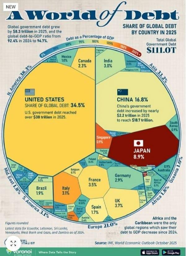 Αυτό το διάγραμμα δείχνει το παγκόσμιο χρέος ανά χώρα το 2025, με βάση στοιχεία από την τελευταία έκθεση του ΔΝΤ για τις Παγκόσμιες Οικονομικές Προοπτικές.