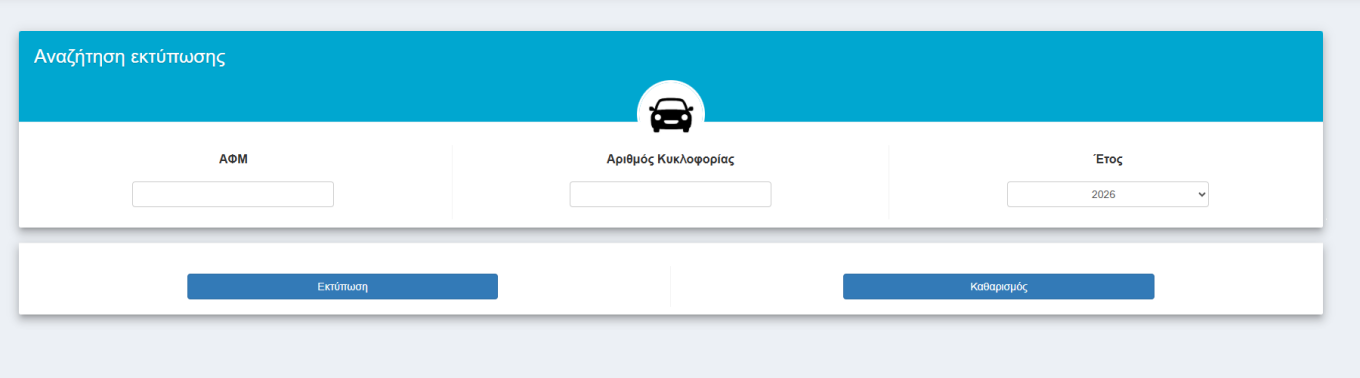 Εισαγωγή ΑΦΜ, αριθμού κυκλοφορίας και έτους τελών κυκλοφορίας.