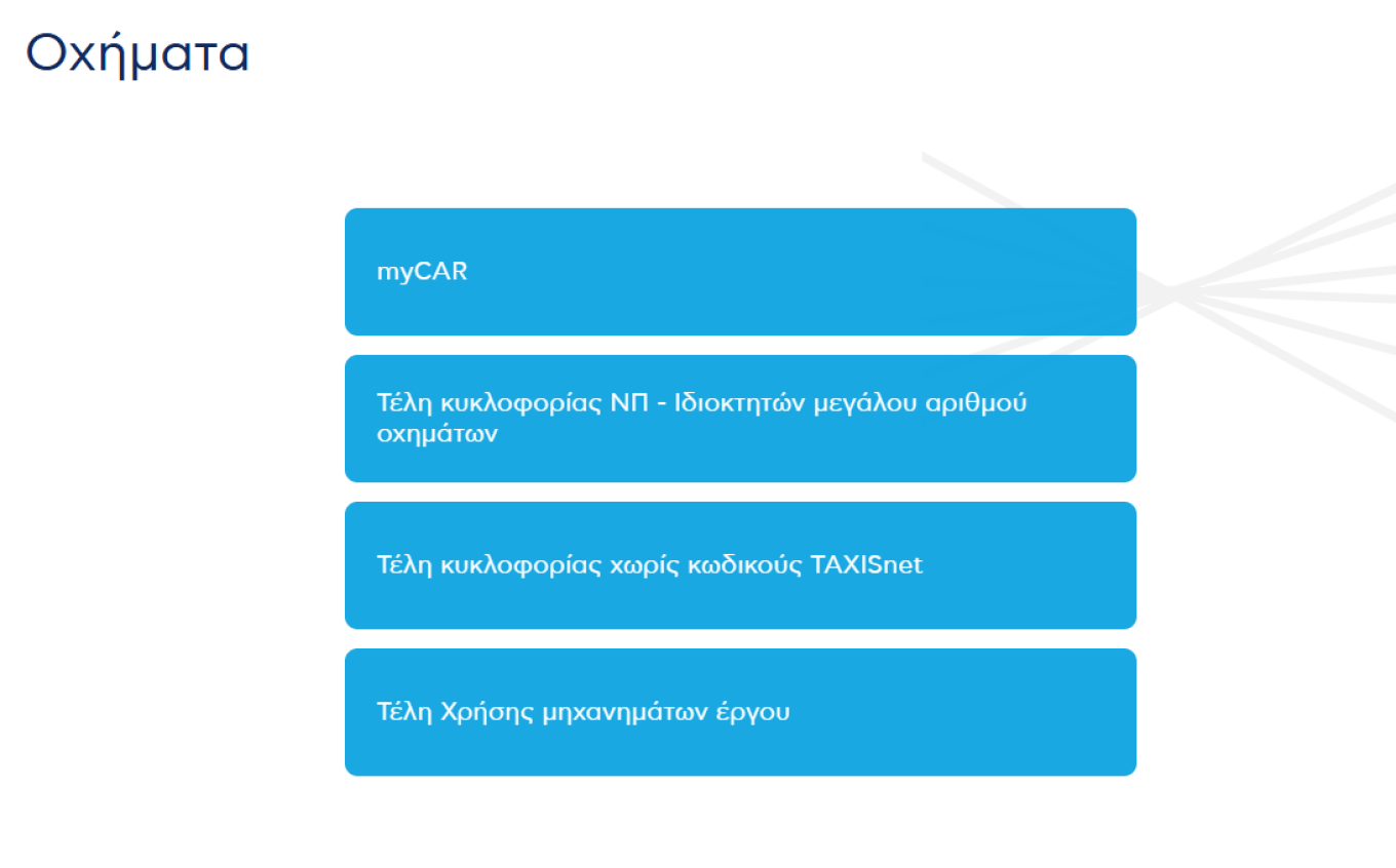 Επιλογή: Ψηφιακές υπηρεσίες > myCAR > Οχήματα > Τέλη Κυκλοφορίας χωρίς TAXISnet.