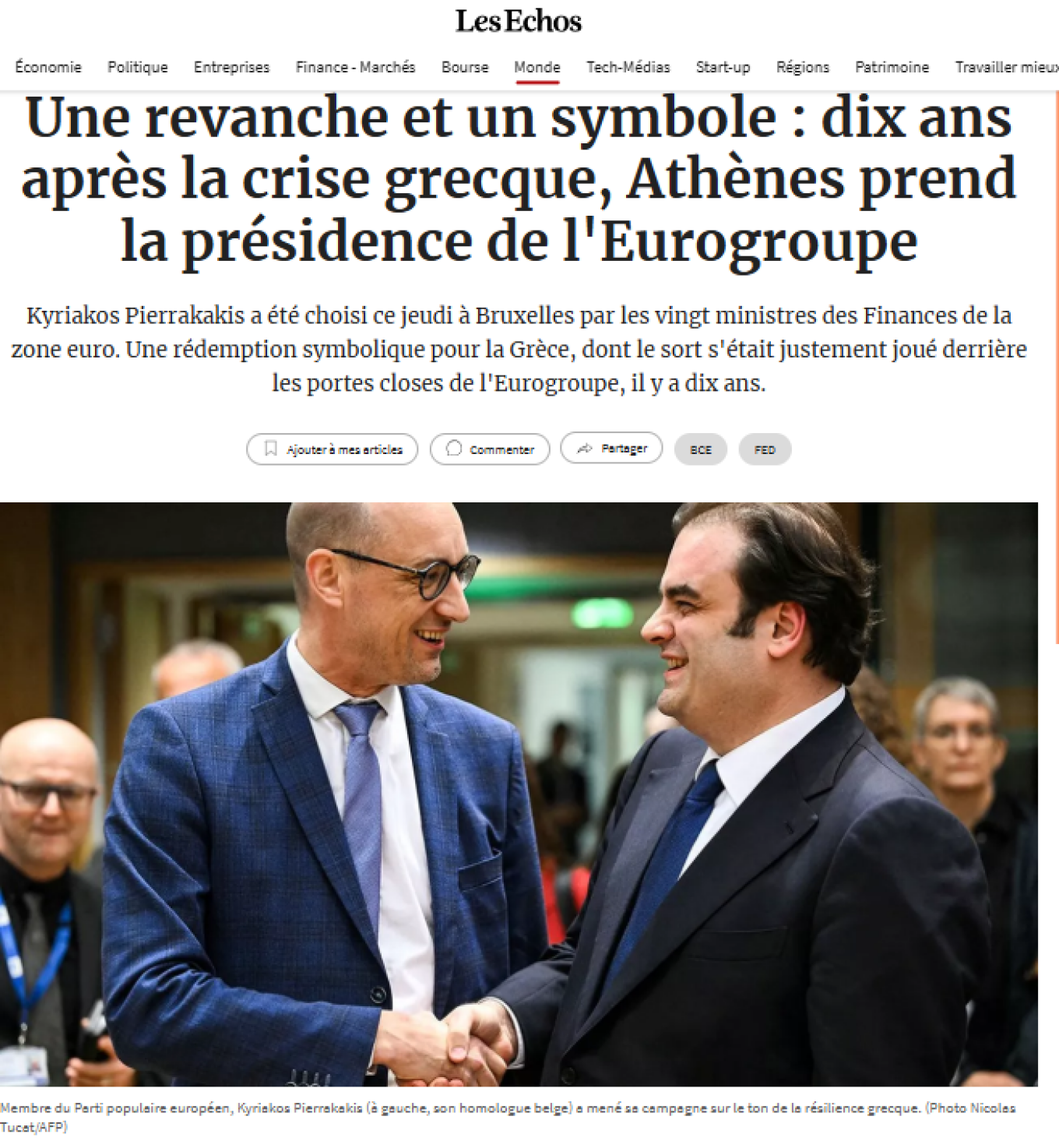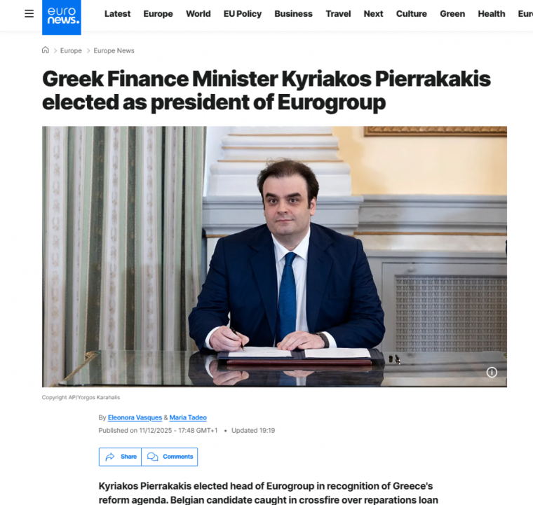 Μια δεκαετία μετά την κορύφωση της οικονομικής κρίσης που απείλησε τη θέση της χώρας στον ευρωπαϊκό πυρήνα, η Ελλάδα καταγράφει μια ιστορική επιστροφή. «Δέκα χρόνια μετά την παραλίγο αποβολή της από την ευρωζώνη, η Ελλάδα παίρνει την εκδίκησή της: ο υπουργός Οικονομικών της, Κυριάκος Πιερρακάκης, εξελέγη την Πέμπτη από τους ομολόγους του ως επικεφαλής του οργάνου που τη διοικεί, της Ευρωομάδας», αναφέρει χαρακτηριστικά η Le Monde. Η γαλλική εφημερίδα ξεκινά την κάλυψη της είδησης μεταφέροντας παράλληλα το μήνυμα του πρωθυπουργού, Κυριάκου Μητσοτάκη, ο οποίος έκανε λόγο για «την πιο λαμπρή αναγνώριση της θετικής πορείας της πατρίδας μας» και για μια ημέρα υπερηφάνειας τόσο για την κυβέρνηση όσο και για τους πολίτες.