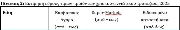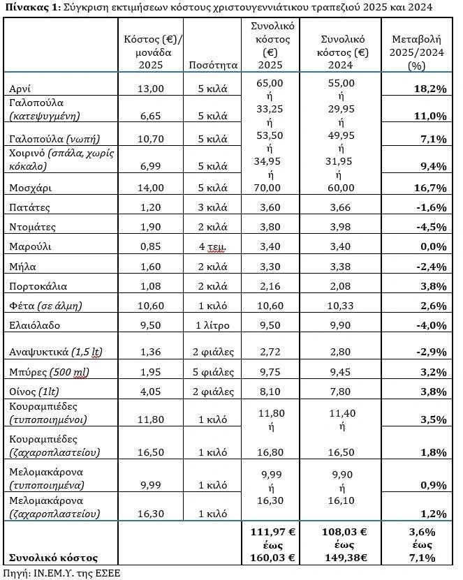 Συγκεκριμένα, η εκτίμηση του κόστους για το φετινό χριστουγεννιάτικο τραπέζι (6-8 ατόμων) κυμαίνεται από 111,97 έως 160,03 ευρώ, με μια μεταβολή της τάξης του 3,6% έως 7,1% σε σχέση με πέρυσι.