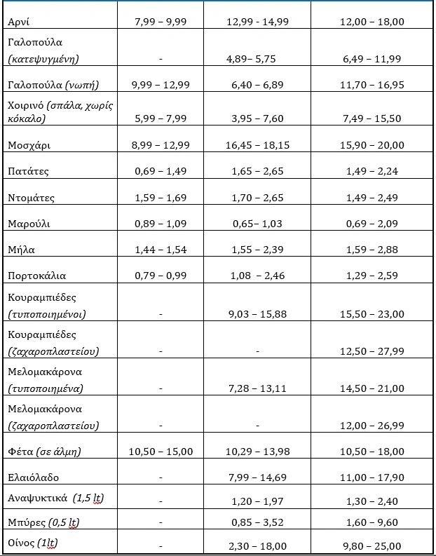 Το εύρος των τιμών δικαιολογείται από την καταγραφή σειράς προϊόντων διαφορετικής ποιότητας, σε αρκετές τοπικές αγορές και διαφορετικούς τύπους καταστημάτων.