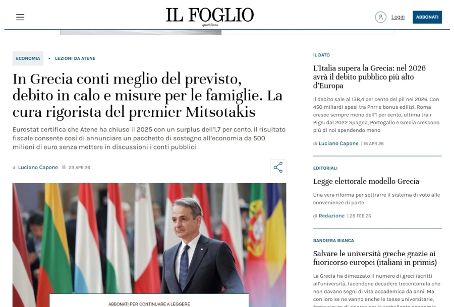Στην δημοσιονομική πραγματικότητα της χώρας μας αναφέρεται, σε άρθρο με τίτλο «μαθήματα από την Αθήνα», η ιταλική εφημερίδα Il Foglio. Στο άρθρο υπογραμμίζεται ότι στην Ελλάδα η δημόσια οικονομία βρίσκεται σε θετικότερη τροχιά από τις προβλέψεις, το χρέος μειώνεται και λαμβάνονται μέτρα για τα νοικοκυριά, χάρη στην στρατηγική που εφαρμόζει ο πρωθυπουργός, Κυριάκος Μητσοτάκης.