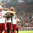 Χιλιάδες φίλοι του Ολυμπιακού βγήκαν στους δρόμους του Φαλήρου, τραγούδησαν συνθήματα της αγαπημένης τους ομάδας, άναψαν καπνογόνα και ο ουρανός φωτίστηκε από δεκάδες βεγγαλικά