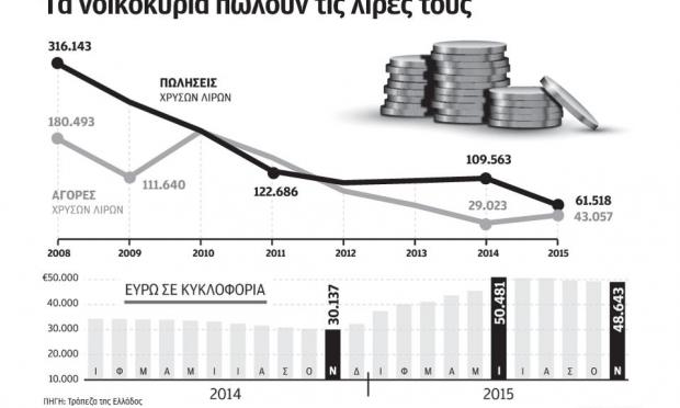 Οπως προκύπτει από τα σχετικά στοιχεία, στη διάρκεια της επταετούς ύφεσης (2008-2015), εάν εξαιρεθεί το 2011, οπότε οι αγορές χρυσών λιρών αυξήθηκαν –προφανώς λόγω φόβου των πολιτών για τη χρεοκοπία της χώρας και επιστροφή της δραχμής– όλες τις υπόλοιπες χρονιές οι πωλήσεις χρυσών λιρών Αγγλίας ήταν σχεδόν διπλάσιες από τις αγορές.