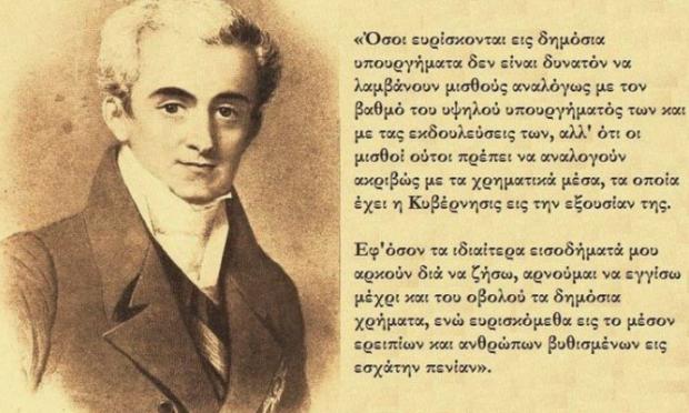 Από τα πιο χαρακτηριστικά παραδείγματα ο Ιωάννης Καποδίστριας, με τον πρώτο κυβερνήτη της χώρας να κάνει λιτή ζωή, παρότι ήταν εύπορος, όπως αναφέρει σε σχετικό αφιέρωμα η εφημερίδα «Ελεύθερος Τύπος». Μάλιστα, μοίρασε αρκετή από την περιουσία του στις ανάγκες του κράτους και των συμπολιτών του, ενώ αρνήθηκε να λαμβάνει το μισθό του κυβερνήτη, δηλώνοντας ότι τα ιδιαίτερα εισοδήματά του του αρκούν για να ζήσει.