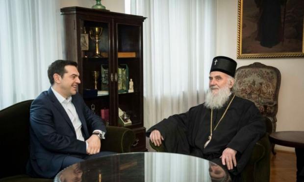 Νωρίτερα, σε άπταιστη ελληνική, υποδέχθηκε στο Πατριαρχείο τον πρωθυπουργό ο Πατριάρχης της Σερβίας, Ειρηναίος, κάτι που επισημάνθηκε και από τον πρωθυπουργό. (Όπως ο ίδιος ο Πατριάρχης γνωστοποίησε νωρίτερα, ύστερα από ερώτηση του Αθηναϊκού-Μακεδονικού Πρακτορείου Ειδήσεων, έκανε μεταπτυχιακό στην Αθήνα το 1963, στη Θεολογική Σχολή της Αθήνας).