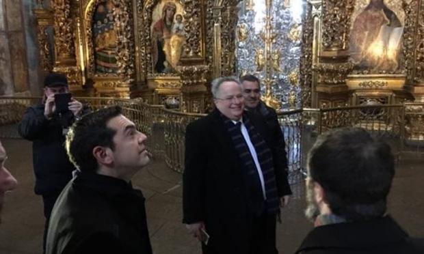 Ο πρωθυπουργός, που συνοδεύεται από τον υπουργό Εξωτερικών Νίκο Κοτζιά, επισκέφθηκε και το μουσείο του ορθόδοξου ναού.
