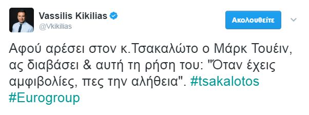 Ο υπουργός Οικονομικών χρησιμοποίησε μια ρήση του αμερικανού συγγραφέα Μαρκ Τουέιν για να απαντήσει στις αιτιάσεις της αξιωματικής αντιπολίτευσης πως είναι «αόρατος», μετά την συνεδρίαση του Eurogroup της περασμένης Δευτέρας. «Οι φήμες για τον θάνατό μου είναι υπερβολικές» είπε ο κύριος Τσακαλώτος, για να του απαντήσει μέσω Twitter ο Βασίλης Κικίλιας: