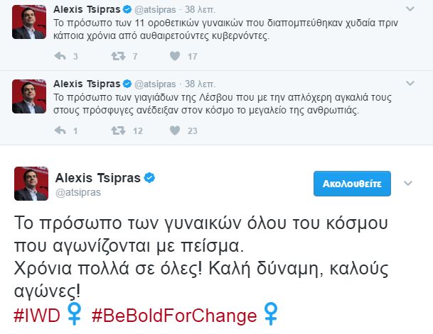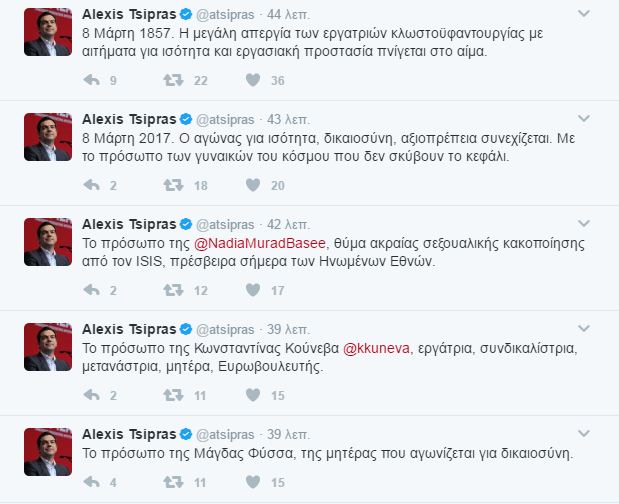 Με μια σειρά αναρτήσεων στον προσωπικό λογαριασμό του στο Twitter ο πρωθυπουργός Αλέξης Τσίπρας έστειλε το μήνυμά του για την Ημέρα της Γυναίκας.