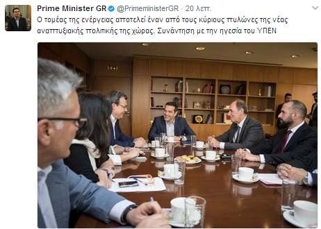«Ο τομέας της ενέργειας αποτελεί έναν από τους κύριους πυλώνες της νέας αναπτυξιακής πολιτικής της χώρας. Συνάντηση με την ηγεσία του ΥΠΕΝ» γράφει ο πρωθυπουργός στο twitter.
