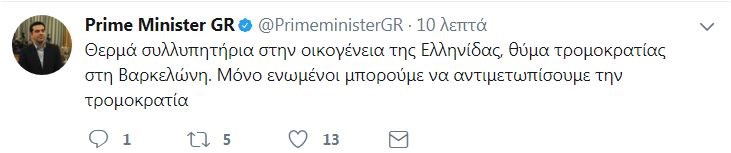 Ειδικότερα, ο πρωθυπουργός αναφέρει στην ανάρτησή του: «Θερμά συλλυπητήρια στην οικογένεια της Ελληνίδας, θύμα τρομοκρατίας στη Βαρκελώνη. Μόνο ενωμένοι μπορούμε να αντιμετωπίσουμε την τρομοκρατία».