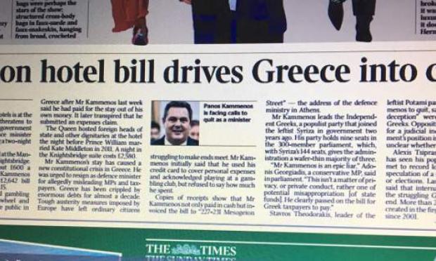 Εως τους Times έφτασε η υπόθεση με τον λογαριασμό που έκανε ο Πάνος Καμμένος κατά την πρόσφατη επίσκεψή του στο Λονδίνο.