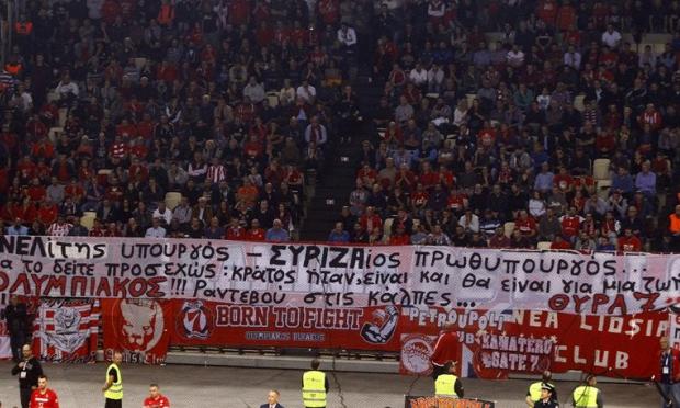 Με πανό που ανήρτησαν οι οργανωμένοι οπαδοί των Πειραιωτών στο ΣΕΦ, στο περιθώριο του ντέρμπι με τον Παναθηναϊκό, επιτέθηκαν εκ νέου σε Σύριζα-ΑΝΕΛ και έστειλαν πολιτικό μήνυμα ενόψει εκλογών.