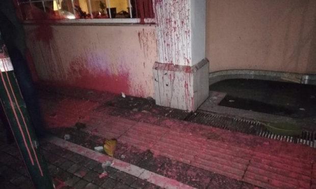 Οι αντιεξουσιαστές πέταξαν μπογιές και πέτρες με αποτέλεσμα να σπάσουν τη τζαμαρία του εστιατορίου του ξενοδοχείου.