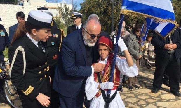 Με τη συνοδεία του υπουργού ναυτιλίας Παναγιώτη Κουρουμπλή και των κατοίκων του νησιού έψαλλε τον εθνικό ύμνο φορώντας την παραδοσιακή στολή και κρατώντας την ελληνική σημαία.