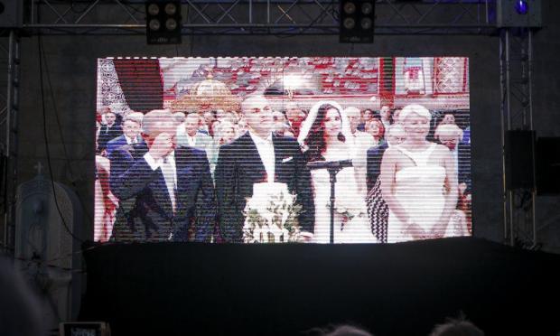 Οι καλεσμένοι ήταν εκατοντάδες και έτσι τοποθετήθηκαν γιγαντοοθόνες στον περίβολο της εκκλησίας για να μπορέσουν να δουν όλοι όσοι πήγαν στην εκκλησία το γάμο του δημάρχου με την μελαχρινή δικηγόρο.