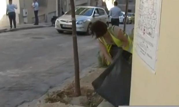 Η κάμερα του ΣΚΑΪ κατέγραψε το περιστατικό και συγκεκριμένα μια γυναίκα δημοτική υπάλληλο του τομέα Καθαριότητας που ξεχορτάριαζε το χώρο μπροστά από το εκλογικό κέντρο.