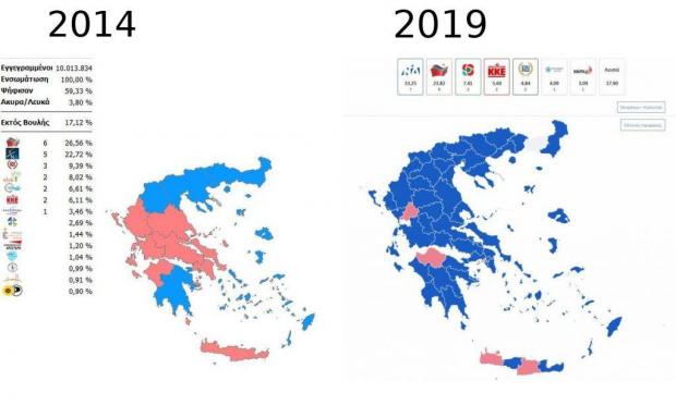 Μέσα σε πέντε χρόνια, ο πολιτικός χάρτης της Ελλάδας άλλαξε χρώμα, με τους πολίτες να γυρνάνε την πλάτη στον ΣΥΡΙΖΑ έπειτα από μία τετραετία διακυβέρνησης (2015-2019). Οι ευρωεκλογές του 2019 καταγράφουν την συντριπτική νίκη της Νέας Δημοκρατίας.