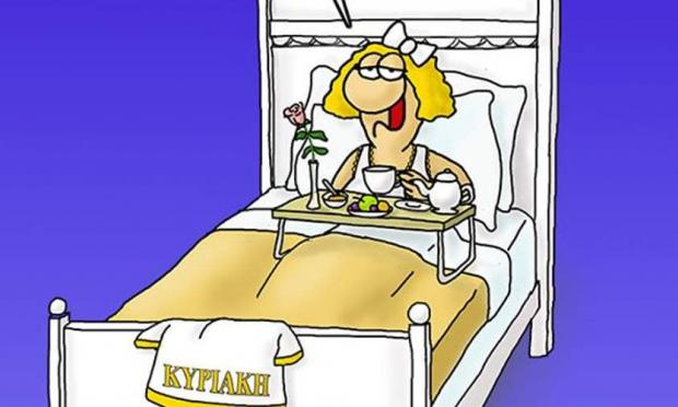 «Μην τεμπελιάζετε! Σηκωθείτε να πάτε να ψηφίσετε!» λέει η «Κυριακη» από το κρεβάτι της, όπου παίρνει ένα απολαυστικό πρωινό.