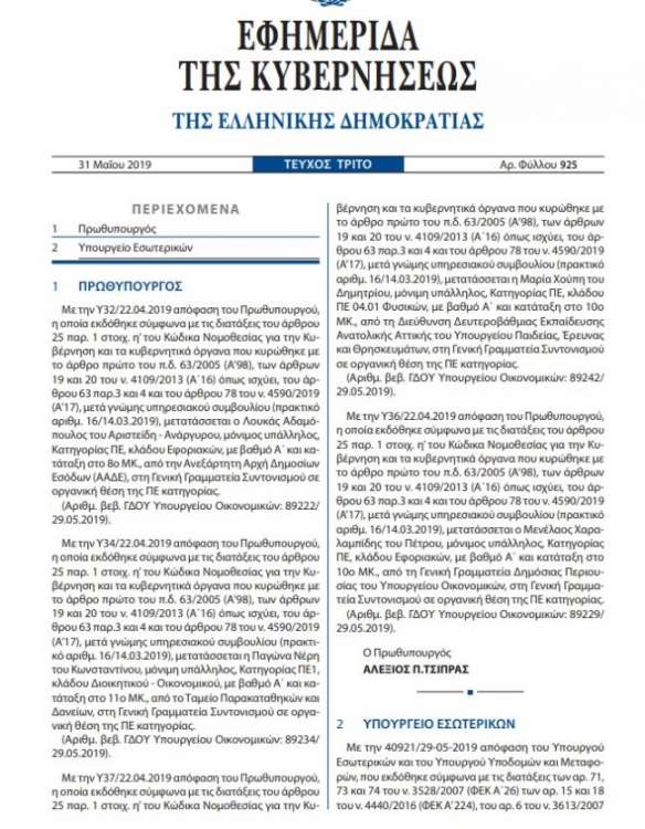 Οπως προκύπτει από την Εφημερίδα της Κυβερνήσεως, στις 31 Μαΐου, κι ενω η χώρα βάδιζε ήδη σε πρόωρες εκλογές μετά την συντριπτική ήττα του κυβερνώντος κόμματος στις ευρωεκλογές, με απόφαση του Αλέξη Τσίπρα, μετατάχθηκαν στην Γενική Γραμματεία του Πρωθυπουργού 4 μόνιμοι δημόσιοι υπάλληλοι, που οι πληροφορίες θέλουν όλοι να είναι στελέχη του ΣΥΡΙΖΑ. Οι μετατάξεις έγιναν λίγα 24ωρα πριν ξεσπάσει το σκάνδαλο με την Τασία Χριστοδουλοπούλου.