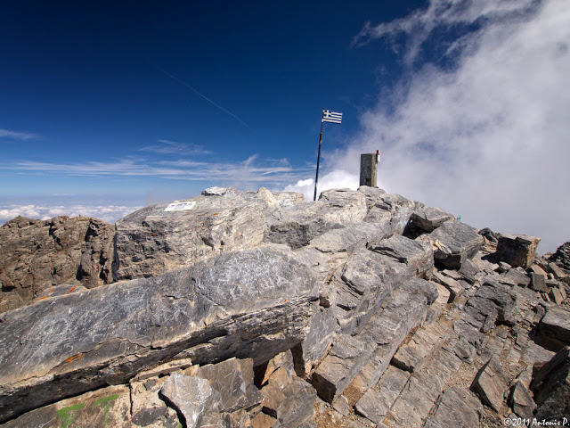 Ίσως το πιο γνωστό κολονάκι (κατασκευασμένο από τον Ε.Ο.Σ.), που παρ’όλα αυτά δεν αποτελεί Τριγωνομετρικό Σημείο (βάθρο) της Γ.Υ.Σ., αυτό στην κορυφή του Ολύμπου, στα 2.918 μ. υψόμετρο. (φωτογραφία: πηγή)