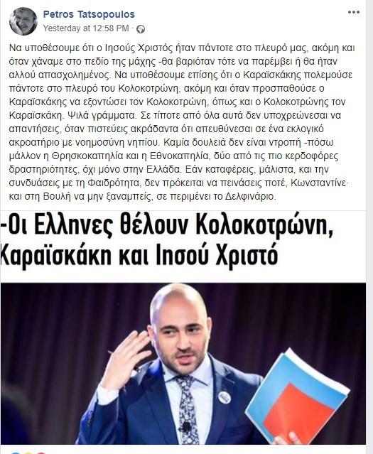 Ο Πέτρος Τατσόπουλος έγραψε στην ανάρτησή του: "Να υποθέσουμε ότι ο Ιησούς Χριστός ήταν πάντοτε στο πλευρό μας, ακόμη και όταν χάναμε στο πεδίο της μάχης -θα βαριόταν τότε να παρέμβει ή θα ήταν αλλού απασχολημένος. Να υποθέσουμε επίσης ότι ο Καραϊσκάκης πολεμούσε πάντοτε στο πλευρό του Κολοκοτρώνη, ακόμη και όταν προσπαθούσε ο Καραϊσκάκης να εξοντώσει τον Κολοκοτρώνη, όπως και ο Κολοκοτρώνης τον Καραϊσκάκη. Ψιλά γράμματα. Σε τίποτε από όλα αυτά δεν υποχρεώνεσαι να απαντήσεις, όταν πιστεύεις ακράδαντα ότι απευθύνεσαι σε ένα εκλογικό ακροατήριο με νοημοσύνη νηπίου. Καμία δουλειά δεν είναι ντροπή -πόσω μάλλον η Θρησκοκαπηλία και η Εθνοκαπηλία, δύο από τις πιο κερδοφόρες δραστηριότητες, όχι μόνο στην Ελλάδα. Εάν καταφέρεις, μάλιστα, και την συνδυάσεις με τη Φαιδρότητα, δεν πρόκειται να πεινάσεις ποτέ, Κωνσταντίνε· και στη Βουλή να μην ξαναμπείς, σε περιμένει το Δελφινά