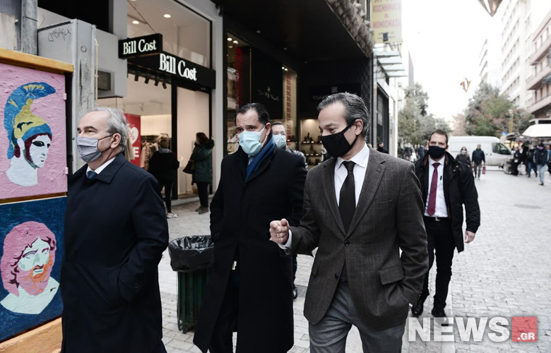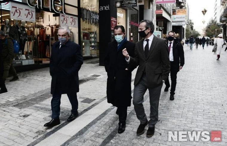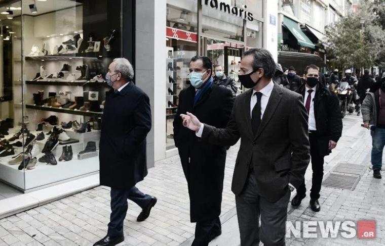 Στην οδό Ερμού βρέθηκαν, προκειμένου να κάνουν αυτοψία για τη λειτουργία των καταστημάτων με τους νέους κανόνες, ο υπουργός Ανάπτυξης Άδωνις Γεωργιάδης με τον αναπληρωτή υπουργό Νίκο Παπαθανάση.