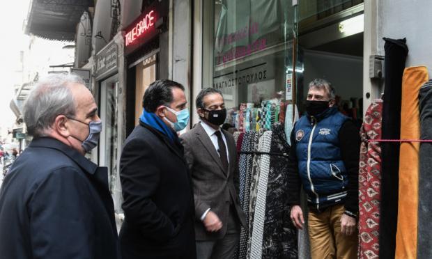 Μαζί με τον πρόεδρο του εμπορικού συλλόγου της Αθήνας, Σταύρο Καφούνη, επισκέφθηκαν καταστήματα και μίλησαν με εργαζόμενους, αλλά και με καταναλωτές.